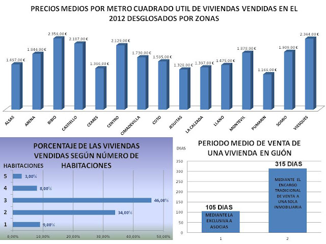 Los precios medios en vivienda de segunda mano dependiendo de zonas rondaron entre los 1200 Euros/m2 hasta los 2.400 Euros/m2. Viviendas más exclusivas de nueva construcción pueden alcanzar los 4.000 Euros/m2. Los precios analizados en Viesques o en el Bibio suelen incorporar plaza de garaje, mientras que las viviendas del centro, al precio medio hay que añadirles el valor de la plaza que puede rondar entre los 18.000 y los 40.000 euros.